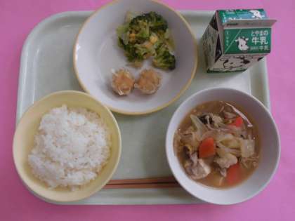 「ごはん、にんじんシューマイ、豚すき焼き、コーンあえ」でした。