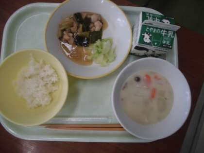「秋の香りシチュー(さつまいも、じゃがいも、しめじなど)、あっさりチキン、ゆでキャベツ、ごはん」でした。