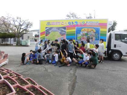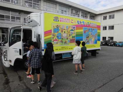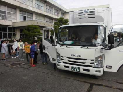 本校5年生に「こんなトラックあったらいいな」絵画コンクールで最優秀賞に輝いた児童がおり、荷台に大きく絵が描かれたトラックが学校に来ました。5年生みんなで夢のトラックを見学したり運転席に乗せてもらったりしました。
