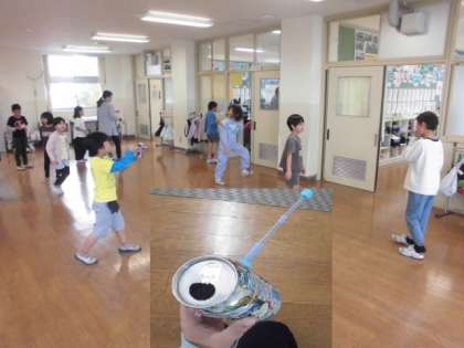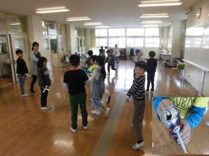 生活科で作った、空き缶ストローや手裏剣などのおもちゃで遊ぶ2年生。工夫して作り、楽しく遊んでいます。