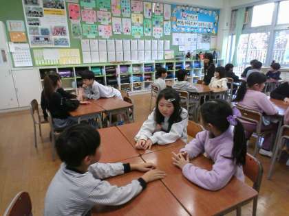国語科「そうだんにのってください」の学習では、みんなで決めた話題について、話し合ってきました。「授業中もっと集中するためには」「休み時間をもっと楽しく過ごすためには」等の話題について、自分から意見を伝えたり、「どうしてですか。」「◯◯さんは、どう思いますか?」と質問したりすることができるようになった子供たちです。他の教科の授業でも、この学習で身に付けた話す聞く力を発揮してほしいと思います。