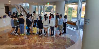 床に描かれた大きな富山県地図を見ながら、神通川や神岡の場所を確認しています。山室中部はどこかな。