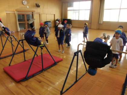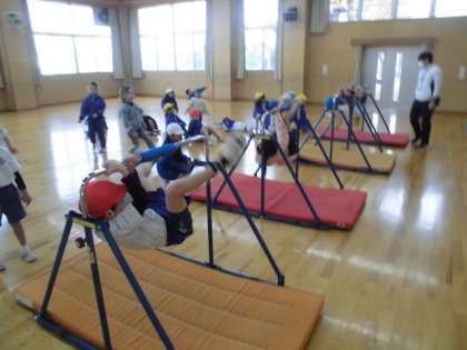 今日から、鉄棒がんばり週間が始まりました。室内鉄棒コーナーを設置して、まず、1年生が、小学校で初めての鉄棒遊びで、ダンゴムシやツバメ、前回りおり、ぶたの丸焼きなどに挑戦しました。