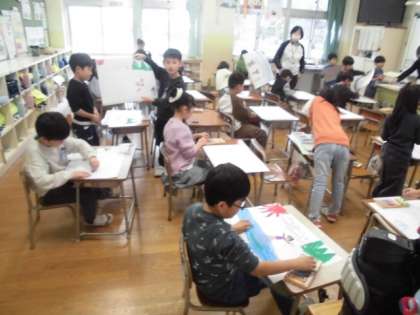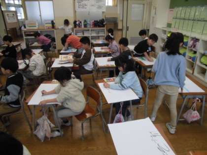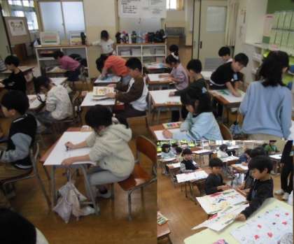 1年生が図画工作で、大きな画用紙にクレヨンで、ダイナミックに絵を描いています。