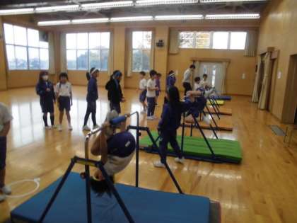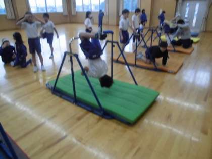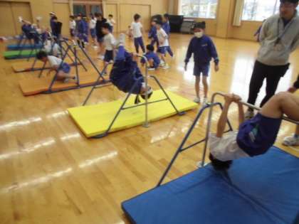 3年生が室内鉄棒運動に取り組んでいます。今日は、ぶたの丸焼きジャンケン、足抜き回り、こうもり降り下りなど、ぶら下がる技を中心に挑戦しました。