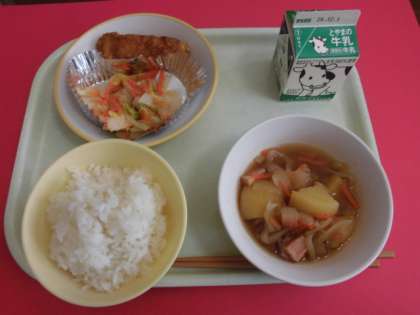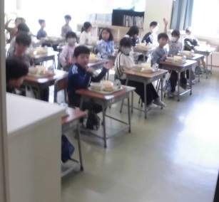 「ごはん、魚の竜田揚げ、甘酢あえ、ベーコンとジャガイモの煮物」でした。上の画像は「いただきます!」と食事が始まる1年生の様子です。