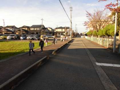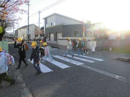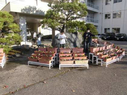 栽培委員会の5年生児童が、新しく植えた春の花鉢に、水やりをしています。その横を、他の子供たちが登校してきました。