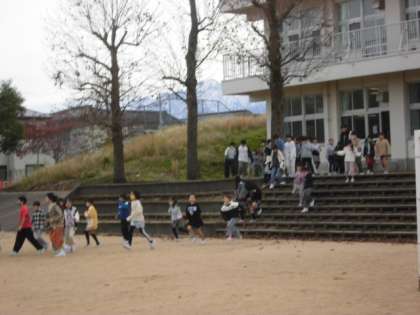 「家庭科室から出火」という想定で、避難訓練を行いました。消防署員に見ていただいて、全校児童がグラウンドに、迅速に静かに避難・集合しました。消防署の方からは「有毒な煙を吸わないように、ハンカチやマスクで口を覆うことが大事」と言われました。