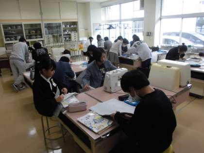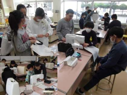 6年生が、ミシンや糸・針、アイロンなどを使ってトートバッグを作成しています。分からないところ、難しい操作を友達と教え合い、協力し合いながら作っています。