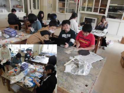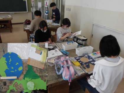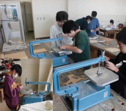 5年生図画工作では、電動糸のこぎりや、普通ののこぎりを使って、思い思いに板を切ってできる作品づくりを楽しんでいます。