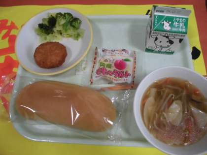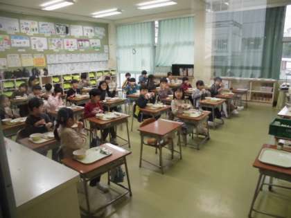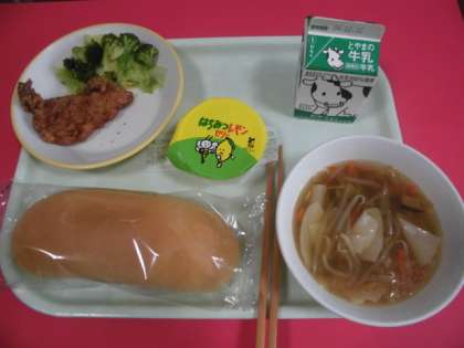 今日の給食は「コッペパン、ワンタンスープ、そえ野菜、豚肉の米粉揚げ・えびカツ、はちみつレモンゼリー・ももタルトの選択」でした。画像は選択献立をおいしく食べる1年3組の様子。