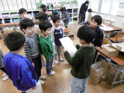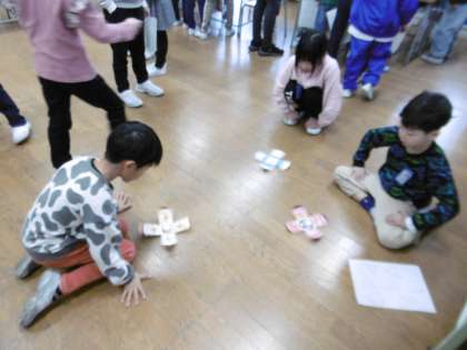 生活科の学習で取り組んできた「うごくおもちゃ」を、1年生にも楽しんでもらおうと準備してきた2年生の子供たち。今日初めて、1年生を招待しました。どのお店も1年生の笑顔がいっぱいで、「行列ができて大変だったけれど、楽しんでくれてうれしかった」と満足そうでした。写真は「ころりんとぐるぐるごま」の様子です。