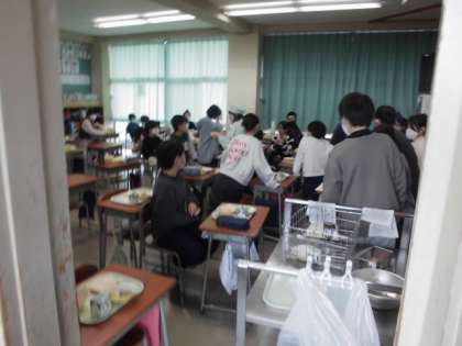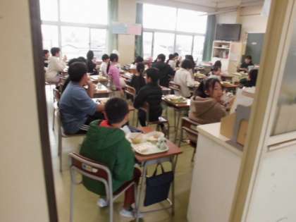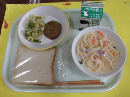 「食パン、鶏つくね、クリームスパゲッティ、切り干し大根のサラダ」でした。画像は、配膳したりおいしく食べたりする5年生。