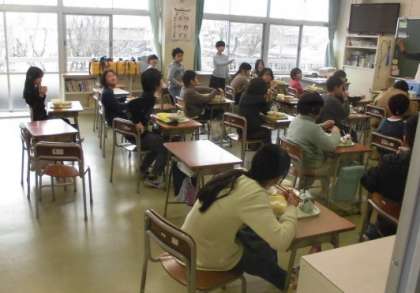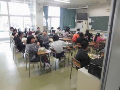 「ごはん、揚げ出し豆腐のごまだれかけ、冬野菜なべ、かぶのいろどり」でした。画像は4年生の様子。2学期の給食もあと6回(日)です。
