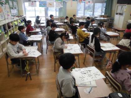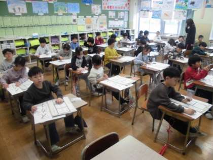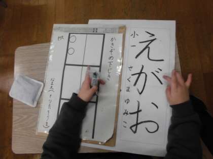 1年1組が硬筆書き初め練習をしています。小学校で初めてなので、まずは、手本や下敷きの置き方を学び、指で「えがお」と練習します。