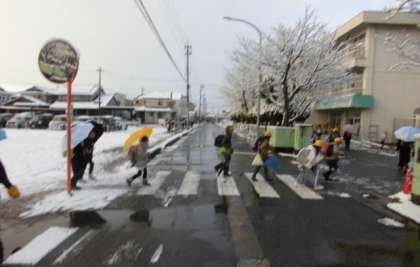 今年初めて雪化粧をしたが道路や校庭を子供たちが登校してきました。明日24日が2学期終業式です。