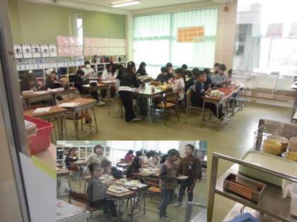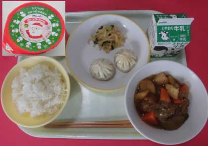 「ごはん、えびパオツ、酢豚、大根のナムル、クリスマスデザート」でした。2学期の給食も、おいしく安全に食べ終えることができました。