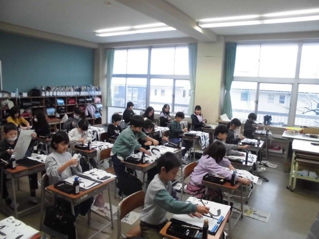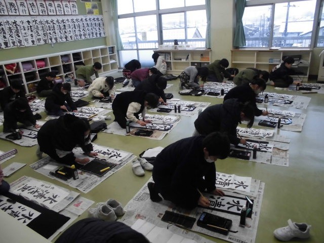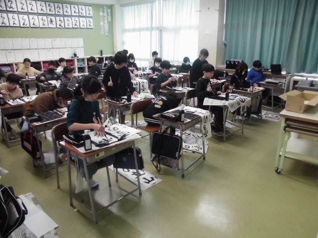 全学級で書き初め大会を行いました。子供たちは、2学期や冬休みに練習してきた成果を発揮しようと、真剣に書いていました。全員の作品を教室後ろや廊下に掲示しました。