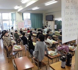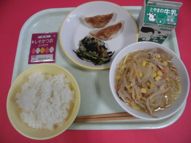 3学期最初の献立は、「サッポロみそラーメン、焼きぎょうざ、鉄たっぷりサラダ、ごはん、しそカツオふりかけ」でした。3学期も、おいしく安全にいただきます!