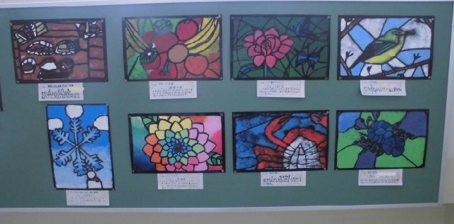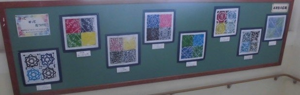 階段には、4・5年生の版画の掲示がしてあります。鮮やかな色とりどりで、たくみな作品を、8日の学習参観の際にご覧ください。