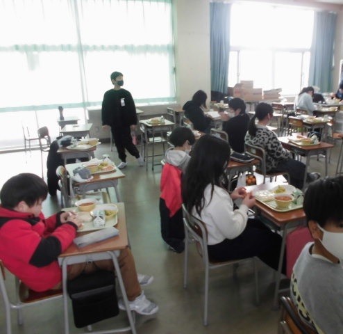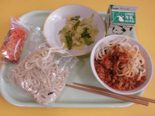 今日の献立は「ミートソースがけソフトめん、チーズドッグ、アスパラサラダ」でした。ソフト麺は、一年に5回しか出ないメニューです。画像は、早く食べたいと待っている5年生の様子。