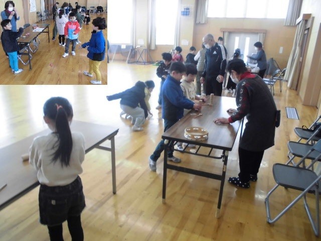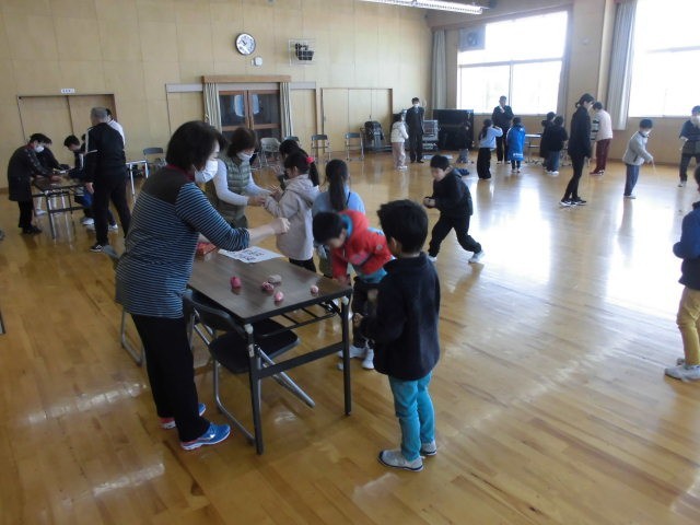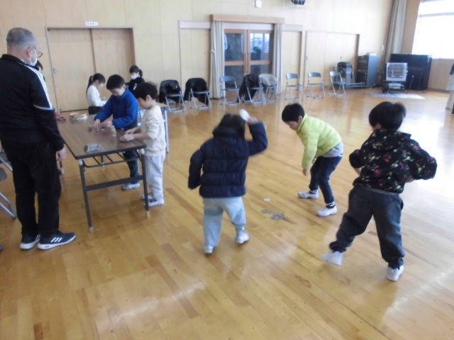 地域のお年寄りの方に、けん玉、メンコ、あやとり、お手玉、こま、だるま落としなどの遊び方を教えてもらい、一緒に楽しく遊びました。中には、けん玉名人の子供もいて「すごい!上手!」と驚いて感心していらっしゃいました。