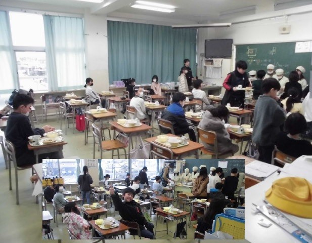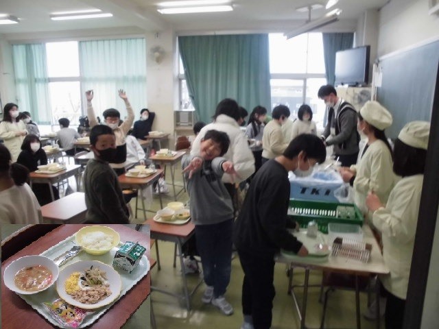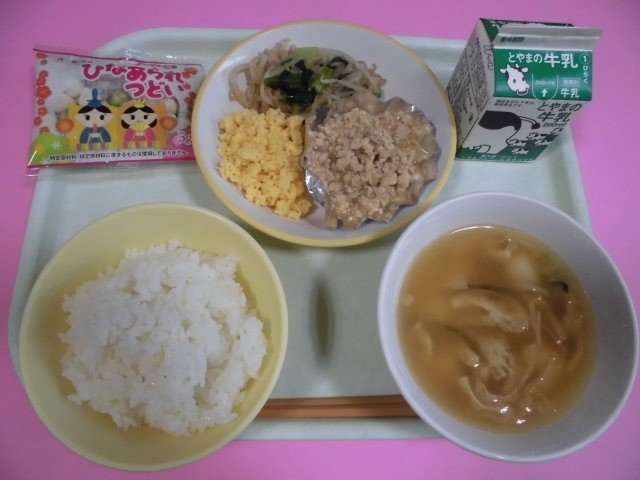 今日の給食は「二色丼(鶏そぼろ、いり卵)、菜花おひたし、白玉じる、ひなあられ」という、少し早い「ひな祭り献立」でした。あと3日で3月です。(画像は4年生の様子)