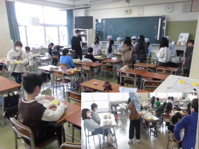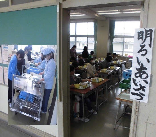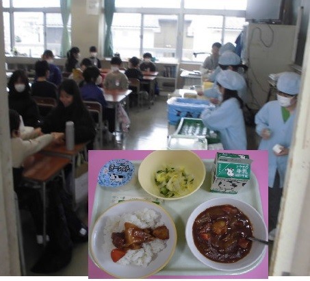 今日の給食は「食べキリンハヤシライス、白菜サラダ、ヨーグルト」でした。画像は3年生の様子。