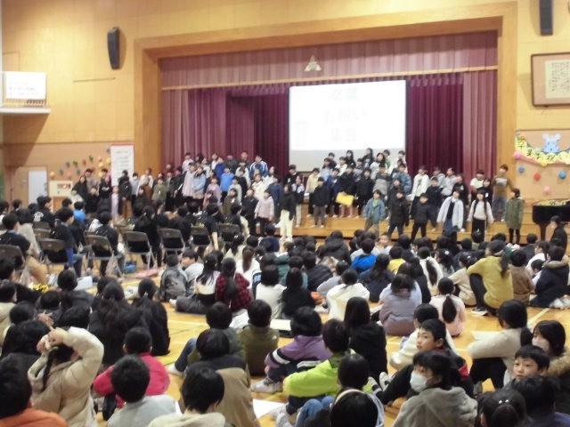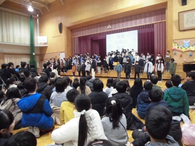 学習発表会や区域音楽会で歌った歌を、「祝う集会バージョン」に少し替えて歌い、感謝の思いを伝える3年生。
