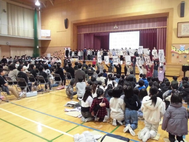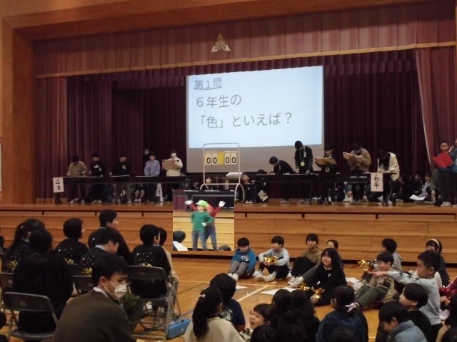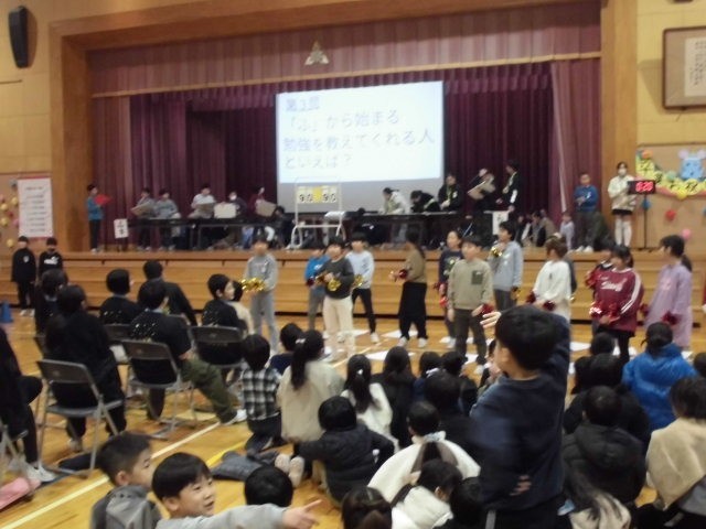 4年生対6年生でクイズや縄跳びをして楽しく競い合ったり、6年生を応援したりする4年生の発表でした。