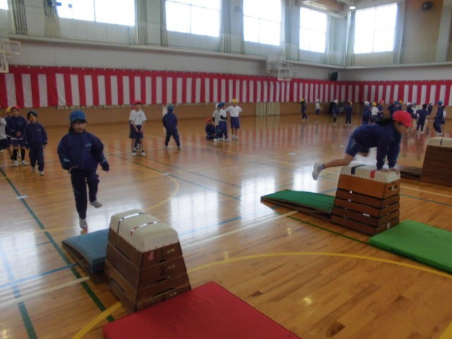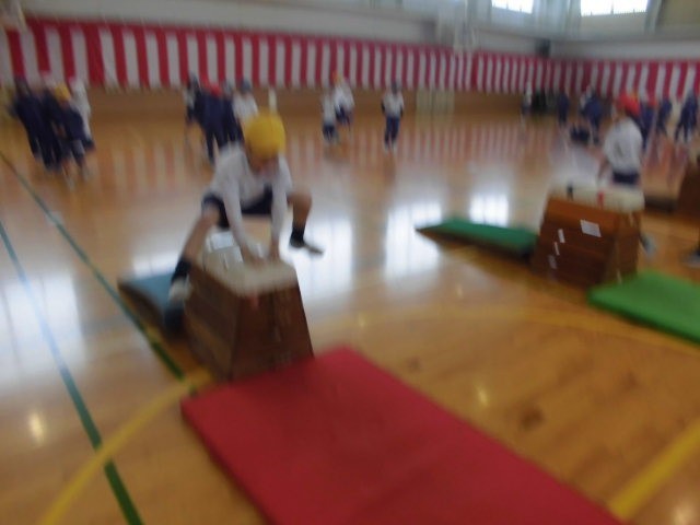 2年生が最後の跳び箱遊びに挑戦しました。縦や横に置いた跳び箱で何度も練習し、中には初めて開脚とびができて喜ぶ子供も見られました。みんながんばりましたね!