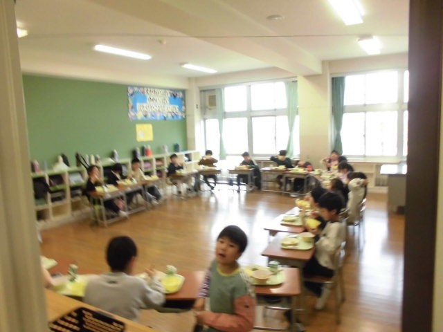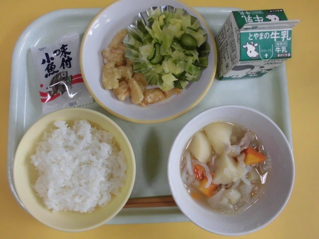 今年度最後の給食は、「ごはん、いかのかりん揚げ、きざみあえ、塩肉じゃが、味付け小魚」でした。一年間、おいしく、安全に給食を食べることができました。