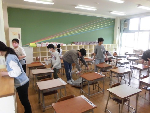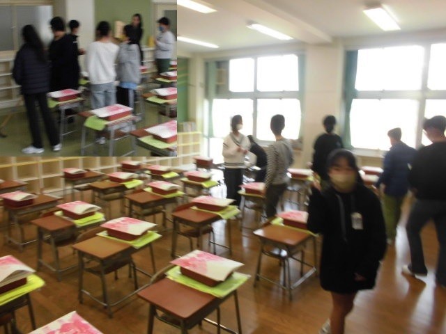 6年生が、入学式前日、1年生廊下を掃除したり、教室の飾り付けや机の配り物準備をする様子です。おかげで、昨日、1年生が気持ちよく入学することができました。「ありがとう6年生。これからも学校のために、よろしくね」