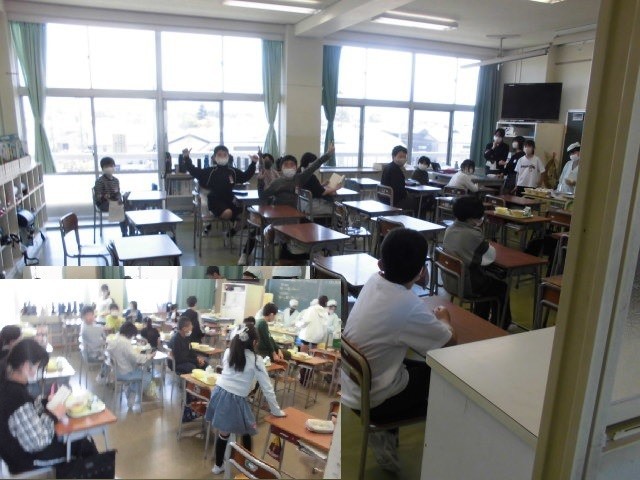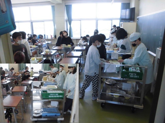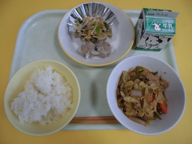 「ごはん、ホイコーロー、肉シューマイ、こうみあえ」でした。上の画像は、準備・配膳を行う5年生の様子です。「おいしそう。早く食べたいなあ」