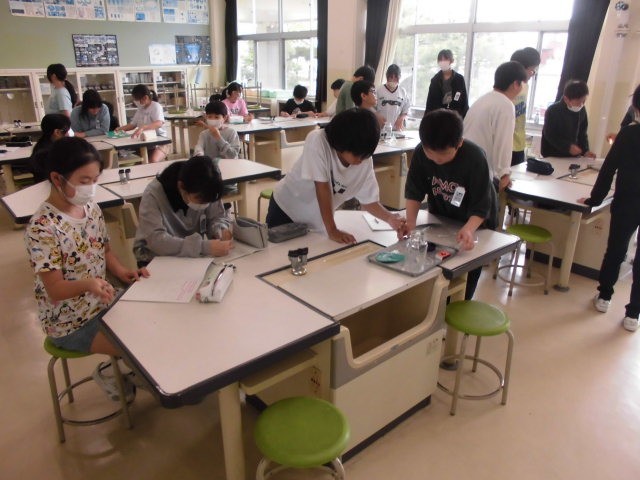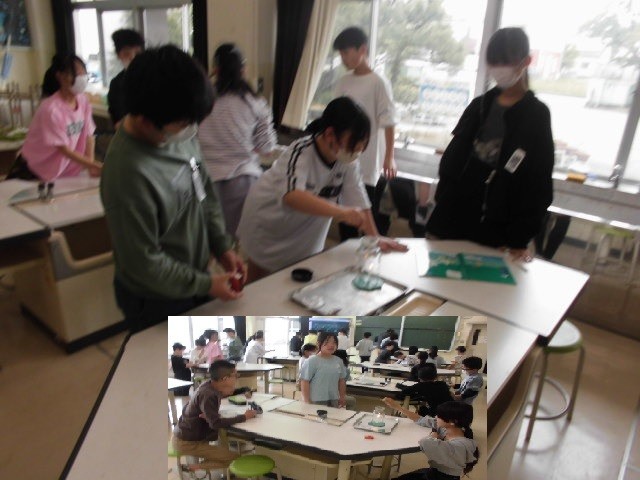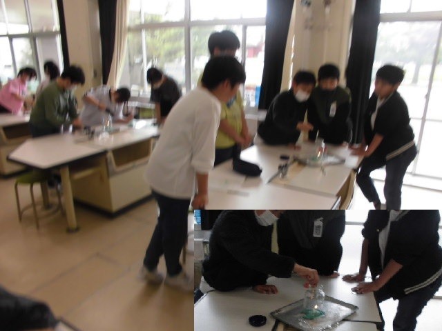 6年生が、理科の学習「物の燃え方と空気」で実験に取り組んでいます。ビーカーの中のろうそくに火をつけて、線香のけむりがどのように動くかなどを調べています。