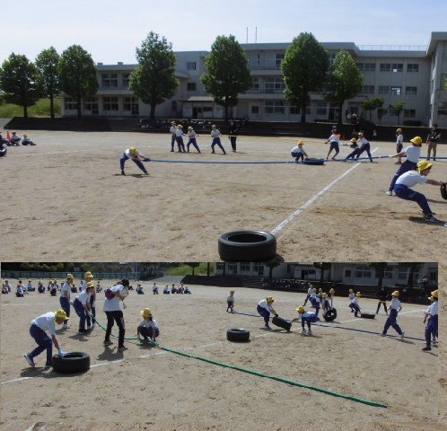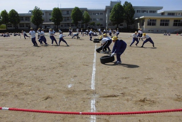 運動会の5・6年団体競技「大乱戦!やまびこブラザーズ」では、5色の綱とタイヤを取り合います。怪我のないように、ルールや安全面の確認をしながら、実際に競技や隊形・移動の練習をしました。あさって(21日)の予行練習では、予選を行います。