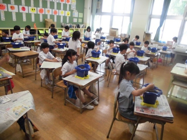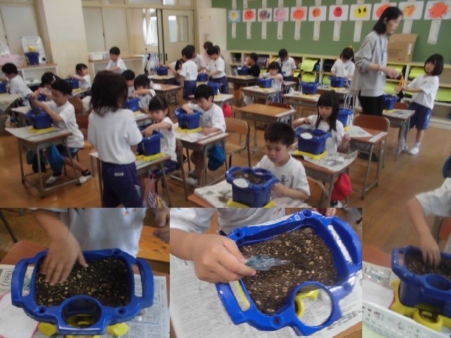 運動会前になりますが、1年生がアサガオの種を植えた時の様子です。毎日水やりをしており、今では、だいぶ芽が出てきました。
