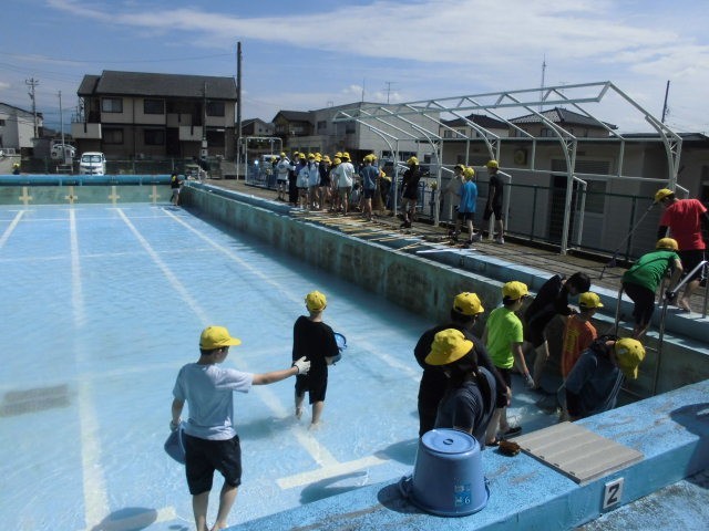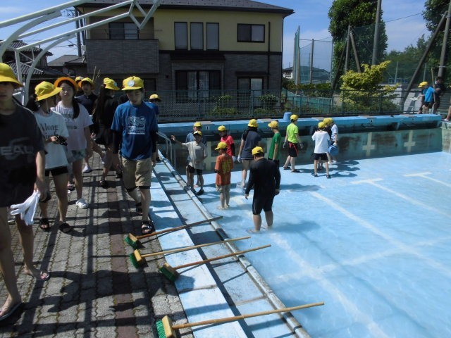 6月12日(木)6年生がプール清掃を行いました。初めは土や落ちた葉などで汚れていましたが、みんなでこすったり掃いたりすると、きれいな壁や床面が見えてきました。「6年生、ありがとう。きれいなプールで泳ぐのが楽しみです!」