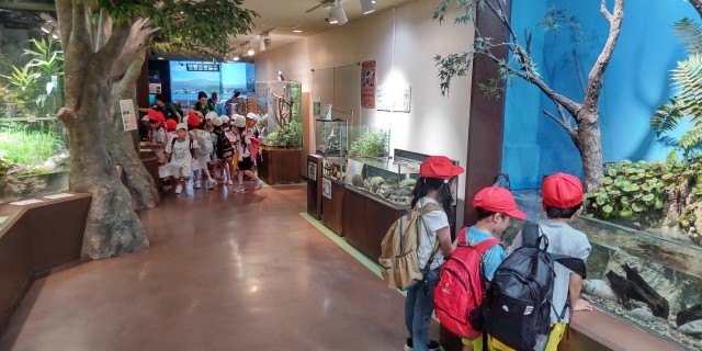 大きな水槽で、きれいな水の中で泳ぐ魚や生き物を見る1年生。