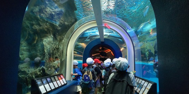 大水槽トンネル、大きな魚、たくさんの小さな魚の群れを下から眺めます。ビックリ!