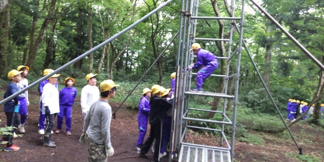 ジョイフレンドゲームで、壁を班で乗り越えるウォールをしました。中には、時間内に全員が登った班もありました。