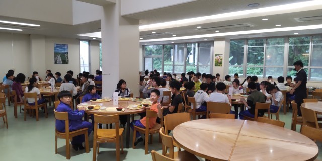 夕食は食堂で。メニューは、エビカツ、チキン、野菜いため、ごはん、みそ汁のバイキングで、みんなお代わりしていました。