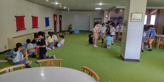 暑さのため、室内で竹を使ったバンブーチャレンジで遊んでいます。これから帰校します。予定より早く、2時半頃、到着し、そのまま下校する予定です。