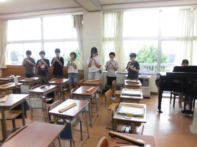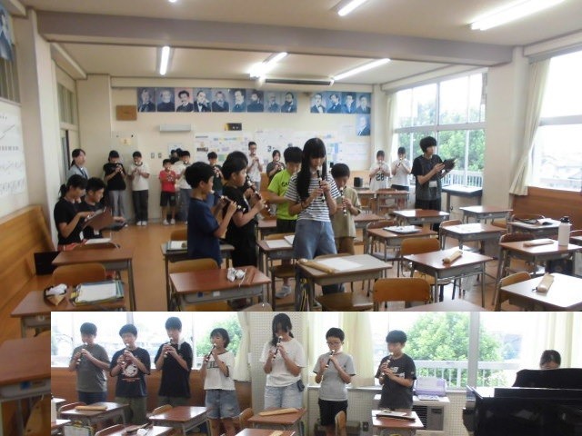 6年生が、リコーダーで、パートごとに練習した成果を、全体で合わせて録音しました。また、Webアプリでつくった演奏データで、4パートを楽器音やテンポを変えたり試したり聴き合ったりしています。