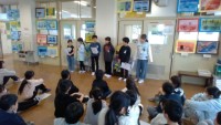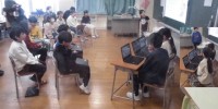 3年生が理科で、糸電話をつかって声がどのように伝わるか試しています。中には、3...