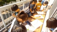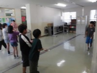 秋空のよく晴れた日、3年生が理科の学習で、日光を鏡ではね返して、グラウンドから...