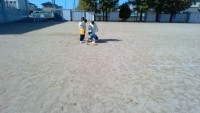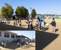 秋晴れの気持ちのよいグラウンドで、4年生が体育でベースボールをしています。思い...
