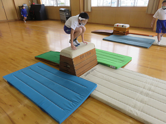 体育科の学習では、跳び箱の学習に取り組んでいます。手の付き方や着地の仕方を意識...