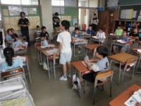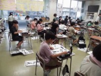4年生が習字で「らん」という題字を書いています。難しいひらがなです。ゆっくりと...