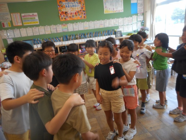 1学期を楽しい思い出で締めくくろうと、子供たちが企画した「3 SUN集会」が開かれました。宝探し、手作りのガチャガチャ、折り紙くじ引き、イラスト大会結果発表、だるまさんがころんだ、クイズ大会、スライドおわらい、じゃんけん列車等、各係が準備してきた出し物を楽しみました。あっという間の2時間でした。